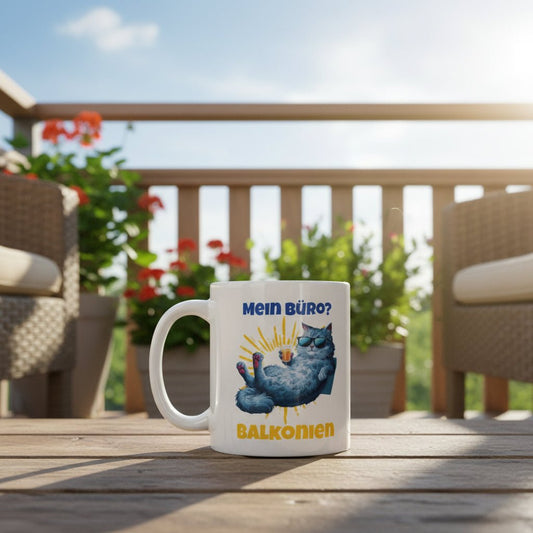 Mein Büro? Balkonien – Lustige Katzen-Tasse für Urlaubsfeeling